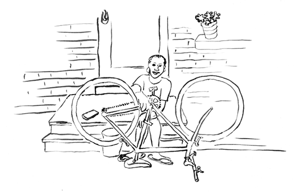 Shante using a champagne bucket to wash her bicycle. “Because I’m classy.”